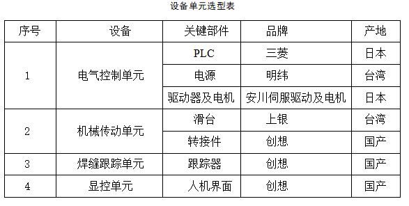 焊縫自動跟蹤焊設備主要分為四個部分:電氣控制單元、機械傳動單元、焊縫跟蹤單元,顯控單元。實現設備由手動跟蹤到自動跟蹤的轉換。減少操作步驟,提高生產效率,改善焊接質量。焊縫自動跟蹤設備單元和選型情況如下表。