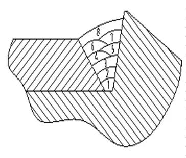 如果焊接焊腳尺寸大于12mm以上的焊件時,可采用三層六道、四層十道來完成, 如下圖所示。焊腳尺寸越大,焊接層數、道數就越多。