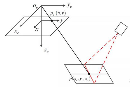依據(jù)激光條紋特征點(diǎn)圖像坐標(biāo)就可以得到其在攝像機(jī)坐標(biāo)系下的三維坐標(biāo):