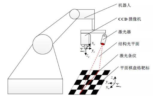 一個六自由度機(jī)器人,一個CCD 工業(yè)攝像機(jī),一個激光器和一個平面棋盤格靶標(biāo)。