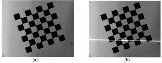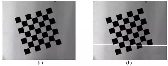 圖像的獲取是在攝機(jī)參數(shù)標(biāo)定過程中同時完成。 首先將棋盤格放在工作臺上, 在這個初始位置,利用攝像機(jī)采集一幅圖,如圖 (a) 所示 。保持?jǐn)z像機(jī)和棋盤格的位置姿態(tài)不變,打開激光器讓條紋投射到棋盤格上, 再采集一幅圖像如圖 (b) 所示: