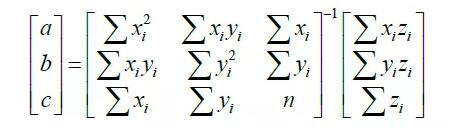 至此,得到四個激光條紋特征點(diǎn)的圖像坐標(biāo),由上式得四個激光條紋特征點(diǎn)在攝像機(jī)坐標(biāo)系下的坐標(biāo),由于三點(diǎn)確定一個平面方程,使用最小二乘法計(jì)算結(jié)構(gòu)光平面方程如下: