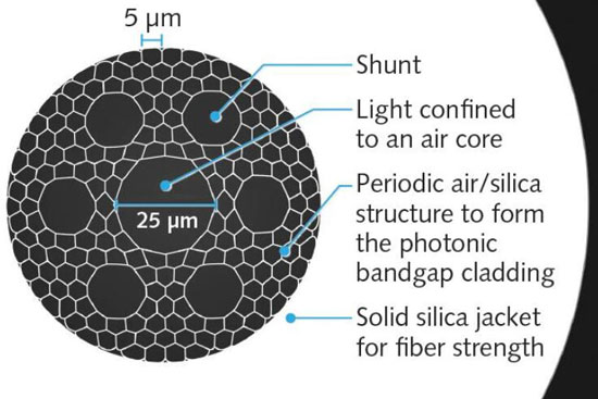 中空光纖使用諸如光子帶隙或反諧振之類的現象將光引導通過空氣填充的芯。經過多年的研究,這種光纖的光損耗已大大降低。這種光纖的一大優點是更高的數據傳輸速度,因為光在空氣中的傳播比在玻璃中的傳播快得多。今年,新推出了一種光子帶隙空心光纖,該光纖的市場特別重視高速傳輸高頻要求。 該光纖可以替代微波塔和數據中心之間“最后一英里”連接中的微波傳輸。與玻璃纖維相比,它的速度優勢使數據交換之間的間隔時間縮短了寶貴的毫秒。