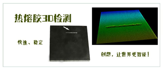 如采用傳統(tǒng)2D檢測(cè)方法,膠道被膠水完全覆蓋,僅通過(guò)2D圖片不易區(qū)分膠水和膠道, 普通的3D傳感器難以識(shí)別熱熔膠的透明光澤, aTiny激光位移傳感器可以3D掃描快速成像、穩(wěn)定檢測(cè),減少包裝行業(yè)的導(dǎo)入工時(shí)。